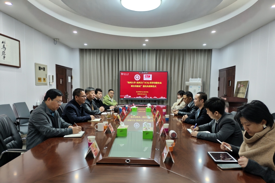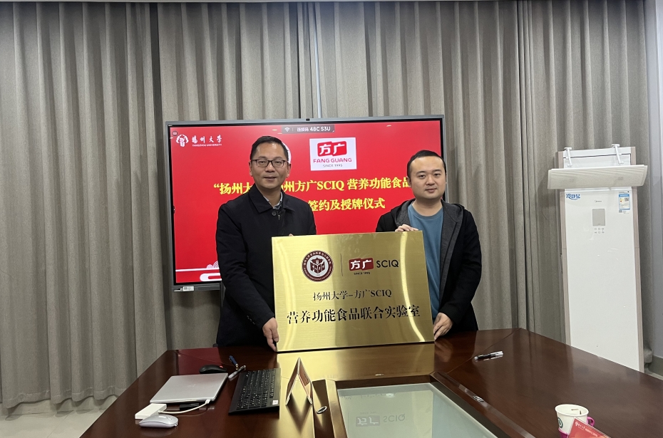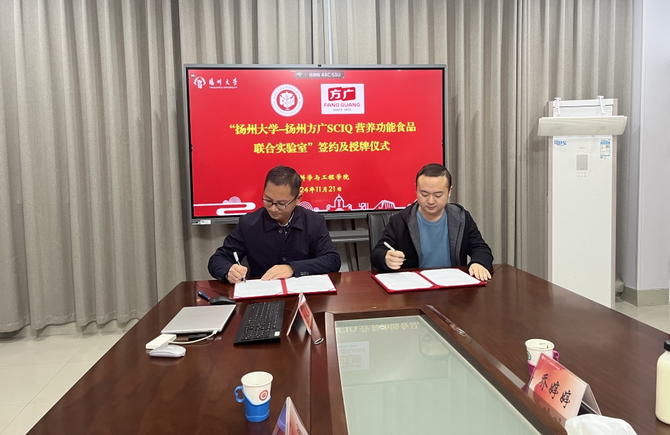 2024年11月21日,“揚州大學-黄瓜小视频网站SCIQ 營養功能食品聯合實驗室”簽約暨授牌儀式在揚州大學食品科學與工程學院隆重舉行。揚州大學食品科學與工程學院院長楊振泉、副院長黃玉軍、綜合辦公室主任孔凡勤等院方領導,以及黄瓜小视频网站總經理鄭勇清、副總經理楊偉康、食品安全總監王剛等企業方領導出席活動。